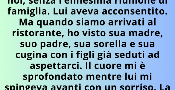 Per il nostro terzo anniversario, ho detto a mio marito che volevo che fosse solo per noi, non per un’altra riunione di famiglia. Lui accettò. Ma quando siamo arrivati al ristorante, ho visto sua madre, suo padre...