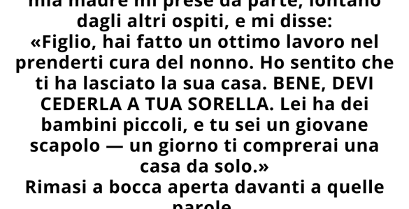 Appena finito il funerale di mio nonno, mia madre mi prese da parte, lontano dagli altri ospiti, e mi disse: «Figlio, hai fatto un ottimo lavoro nel prenderti cura del nonno. Ho saputo che ti ha lasciato la sua casa...