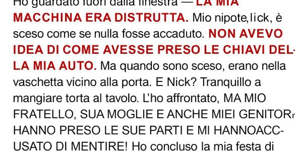 Avevo appena iniziato a cercare sedie extra per gli ospiti in soffitta quando ho sentito il rumore stridente di un’auto. Ho guardato fuori dalla finestra: la mia macchina era distrutta. Mio nipote, Nick, è uscito...