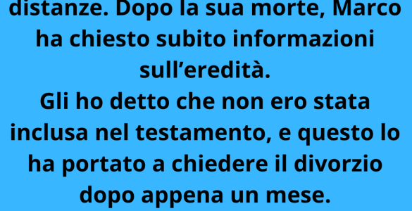 Mio padre era un avvocato molto noto. Non ha mai sopportato mio marito, Marco, e ha sempre mantenuto le distanze. Dopo la sua morte, Marco chiese subito dell’eredità. Gli dissi che non ero stata inserita nel testamento...