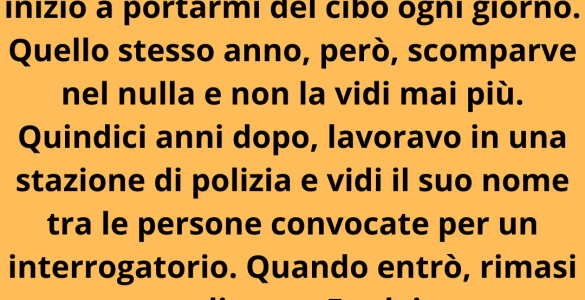 Una compagna di classe se ne accorse e iniziò a portarmi del cibo ogni giorno. Quello stesso anno, però, scomparve. E non la rividi mai più. Quindici anni dopo, lavoravo in una stazione di polizia. Un giorno, vidi il...