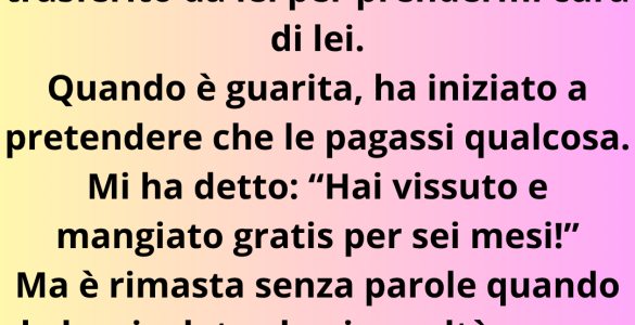 Quando ha iniziato a stare meglio, mi ha detto che ora vuole che io la rimborsi. Ha detto: «Hai vissuto e mangiato gratis per sei mesi!» Ma si è bloccata quando le ho rivelato che, in realtà, avevo segretamente venduto...