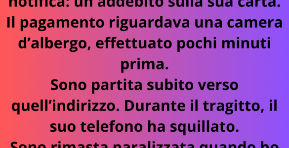 Ieri, il suo telefono ha suonato. Era una notifica di un addebito sulla sua carta. Il pagamento riguardava una camera d’albergo, effettuato pochi minuti prima. Sono partita subito verso quell’indirizzo. Durante il...