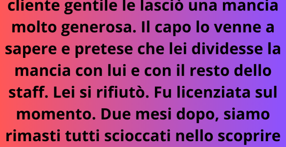 Nel nostro team c’era una cameriera incinta che lavorava senza sosta. Un giorno, un cliente gentile le lasciò una mancia enorme. Il capo lo venne a sapere e pretese che lei dividesse la mancia con lui e con il resto...