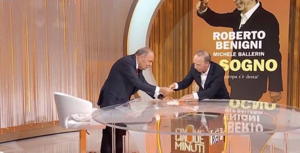 Roberto Benigni ospite nella rubrica “Cinque Minuti” di Bruno Vespa scherza sul celebre contratto firmato da Berlusconi, chiedendo ironicamente il tavolo in ciliegio e riproponendo slogan in chiave buffonesca...