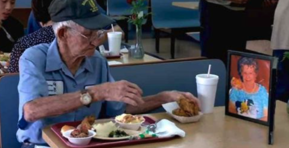 Il diner era affollato, pieno di chiacchiere e di posate che tintinnavano, ma lui sedeva tranquillo al suo tavolo per due. Un vassoio. Due piatti. Uno per lui e uno accuratamente posizionato davanti a una fotografia...