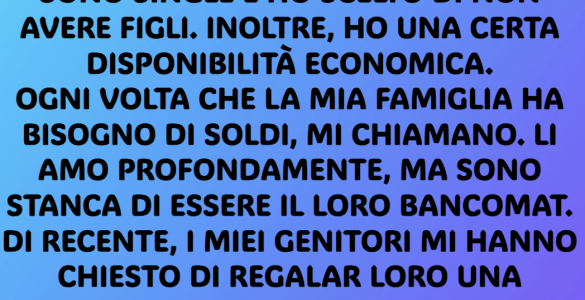Sono single e ho scelto di non avere figli. Inoltre, ho una buona situazione economica. Ogni volta che la mia famiglia ha bisogno di soldi, mi chiama. Li amo con tutto il cuore, ma sono stanca di essere il loro bancomat...