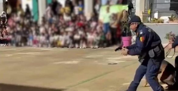 Un agente di polizia locale che estrae l’arma di ordinanza, urla e poi spara a salve e infine aizza il cane dell’unita cinofila contro un finto ladro per arrestarlo, la sequenza era una messa in scena per mostrare nelle...