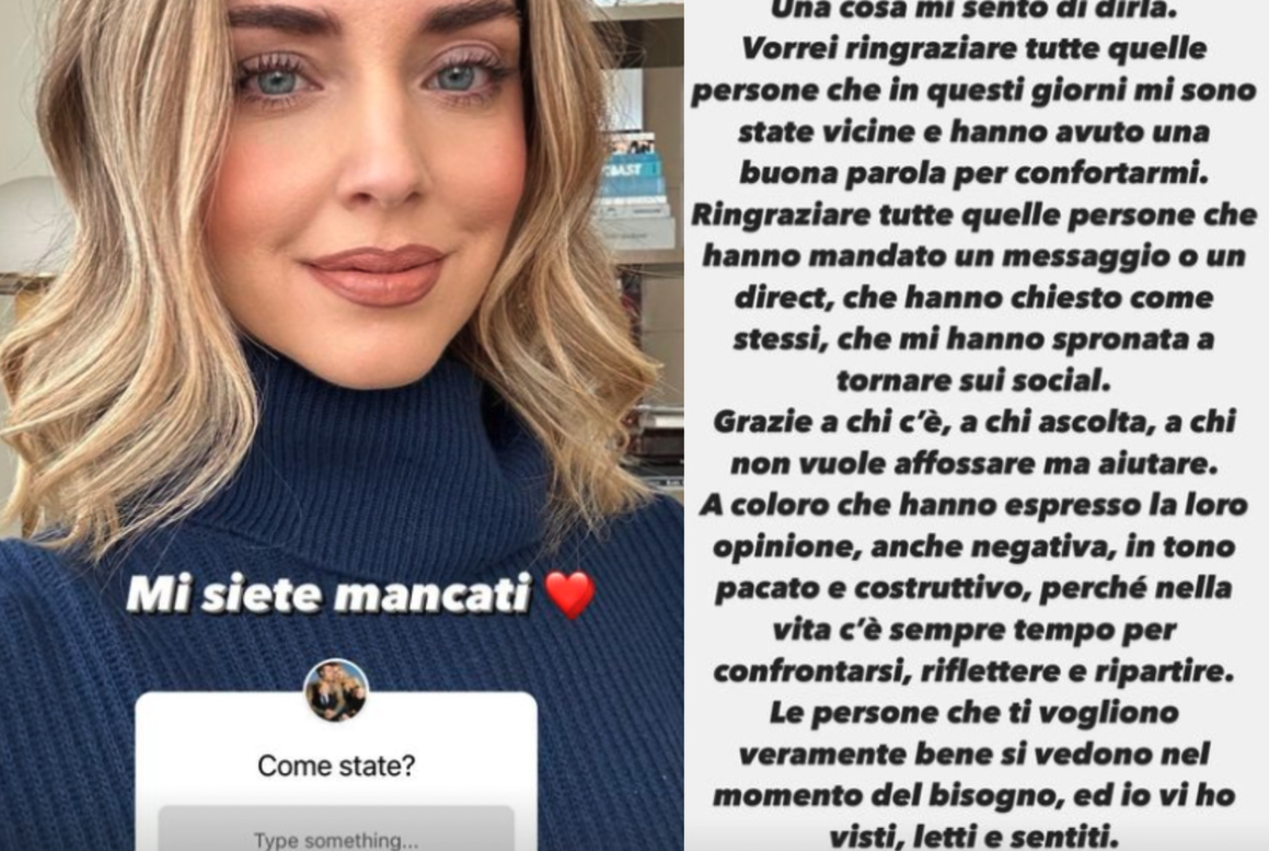 Intrattenimento Chiara Ferragni è di nuovo su Instagram e saluta i suoi fan con un messaggio affettuoso: “Mi siete mancati. Come state? Nella vita c’è sempre tempo per ripartire”. Emanuela B.03/01/2024